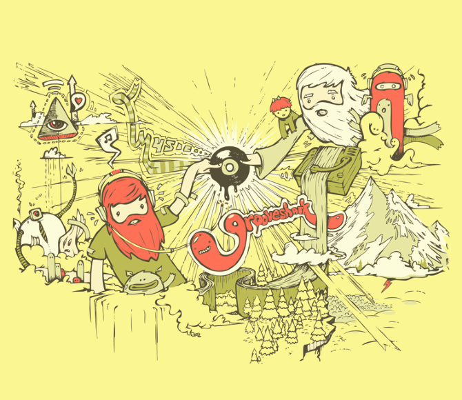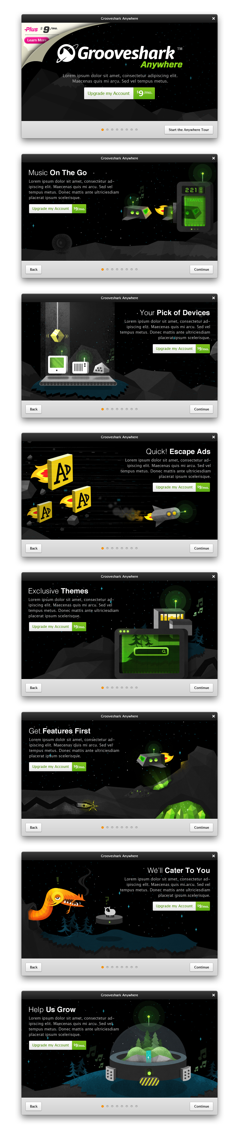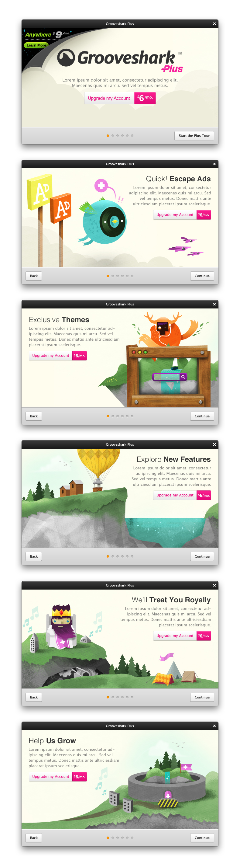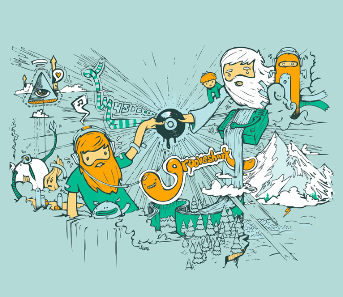 A mess of old illustrations lying around for old Grooveshark branding, themes and merchandise. Uses range from backdrops inside of the UI, user walkthroughs, and t-shirts.