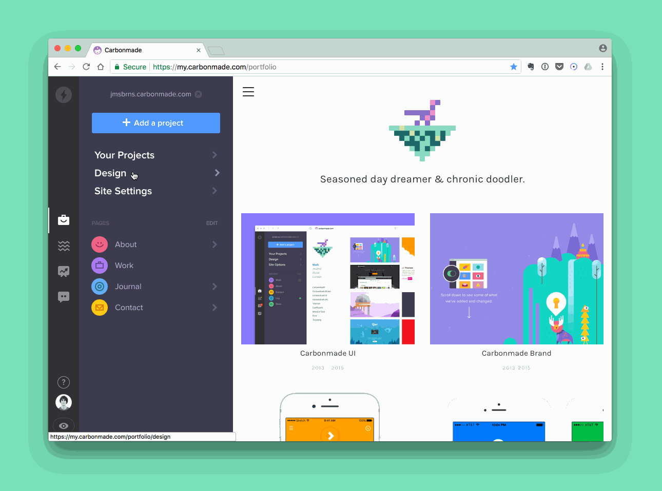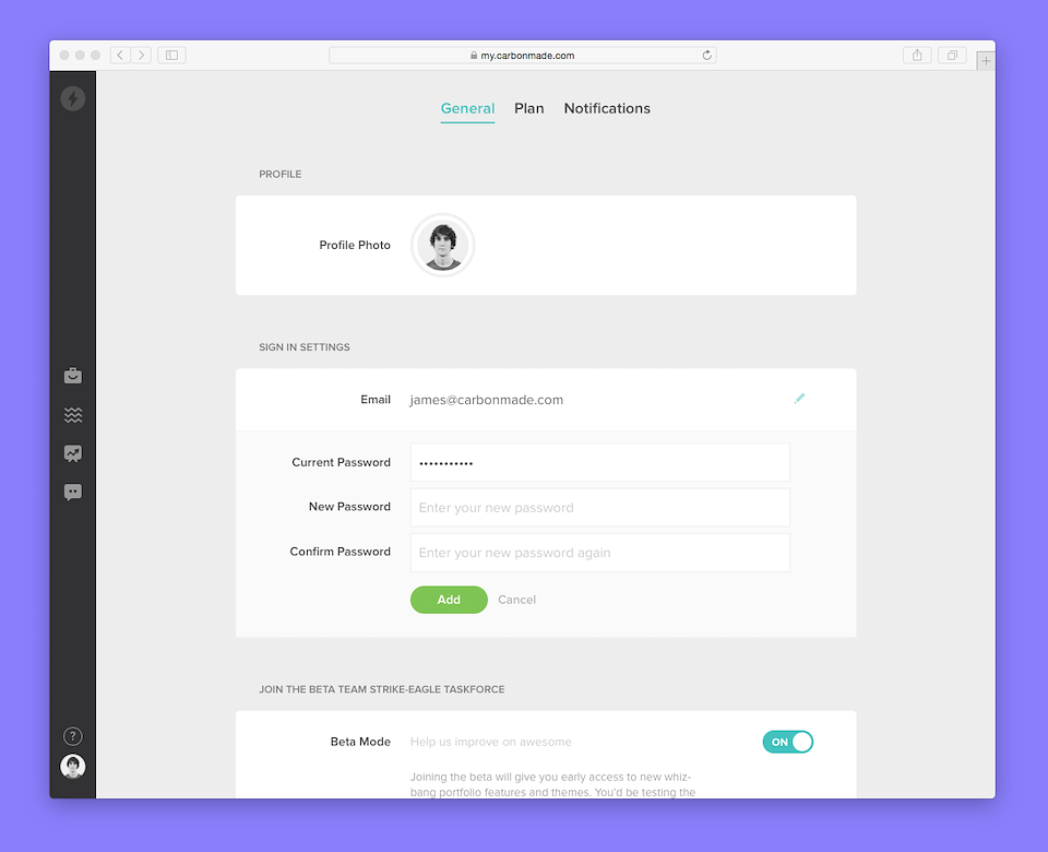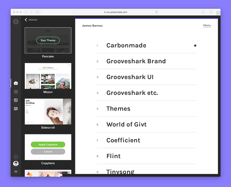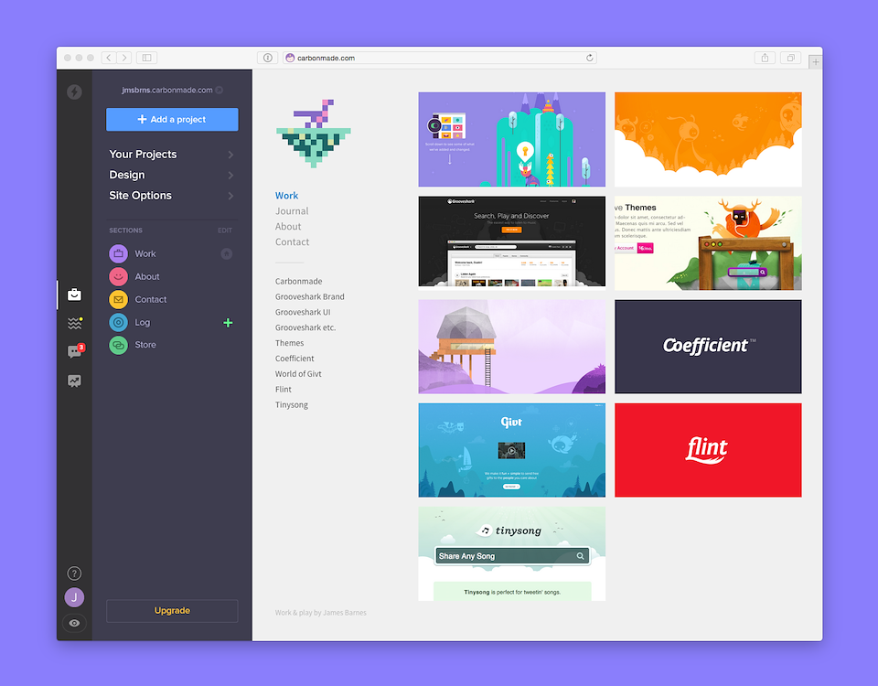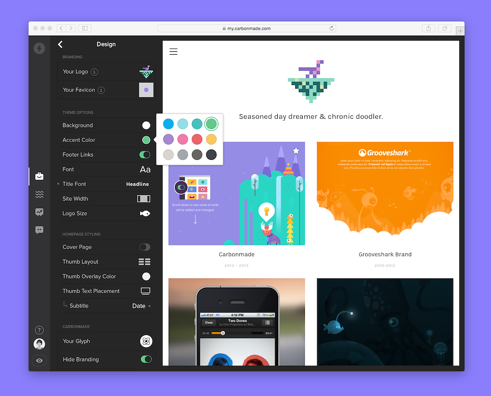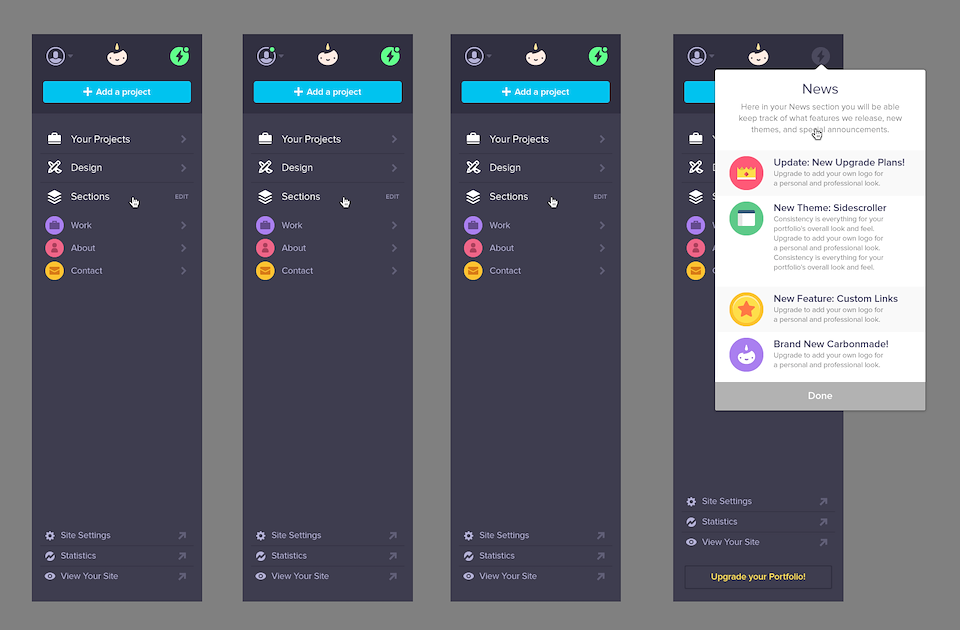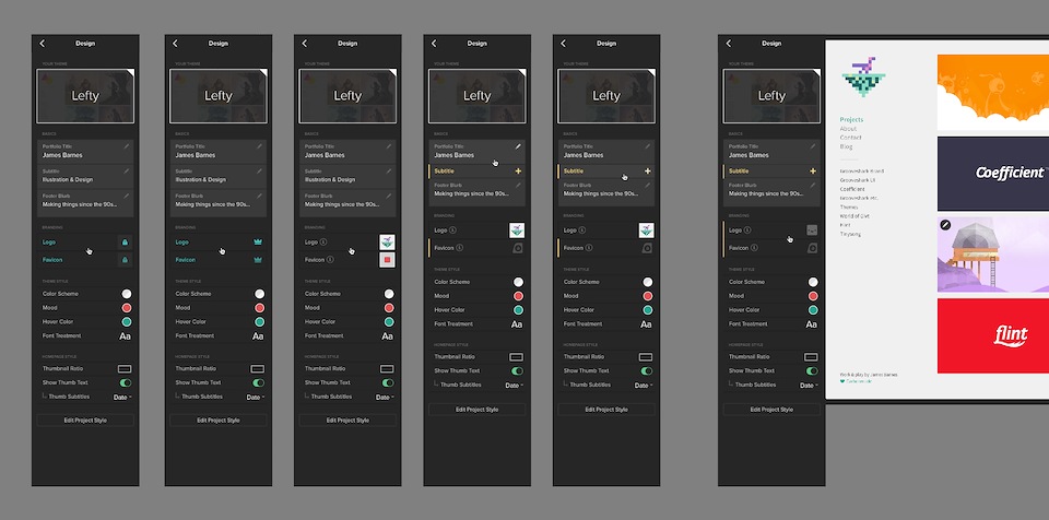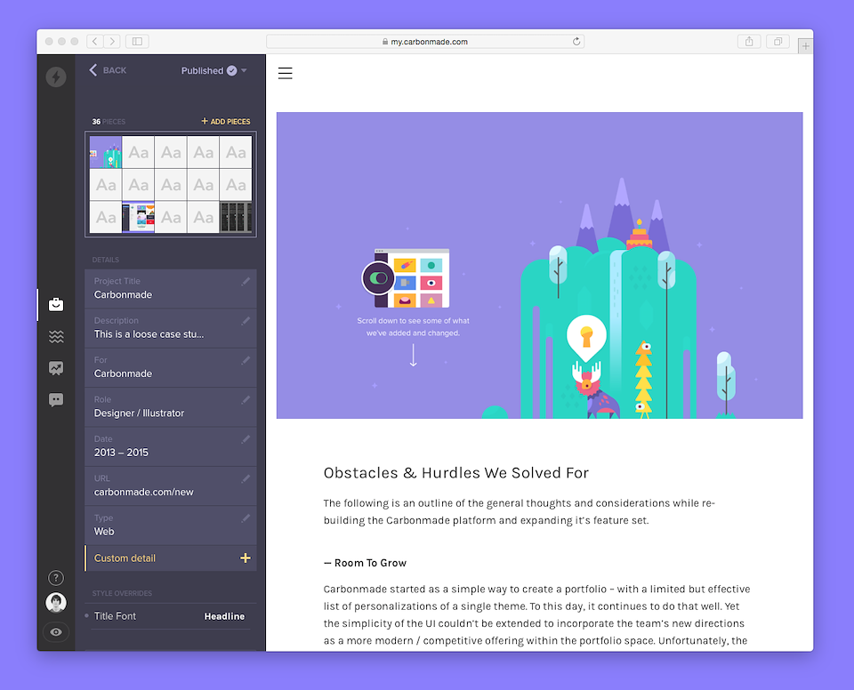 Carbonmade started as a simple way to create a portfolio with a limited but effective list of personalizations on a single theme. To this day, it continues to do that well. Yet the simplicity of the UI couldn’t be extended to incorporate the team’s new directions as a more modern / competitive offering within the portfolio space.