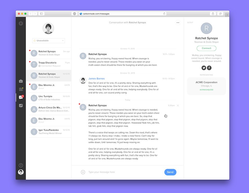 Carbonmade’s messaging app for communicating between Talent and their prospective clients.